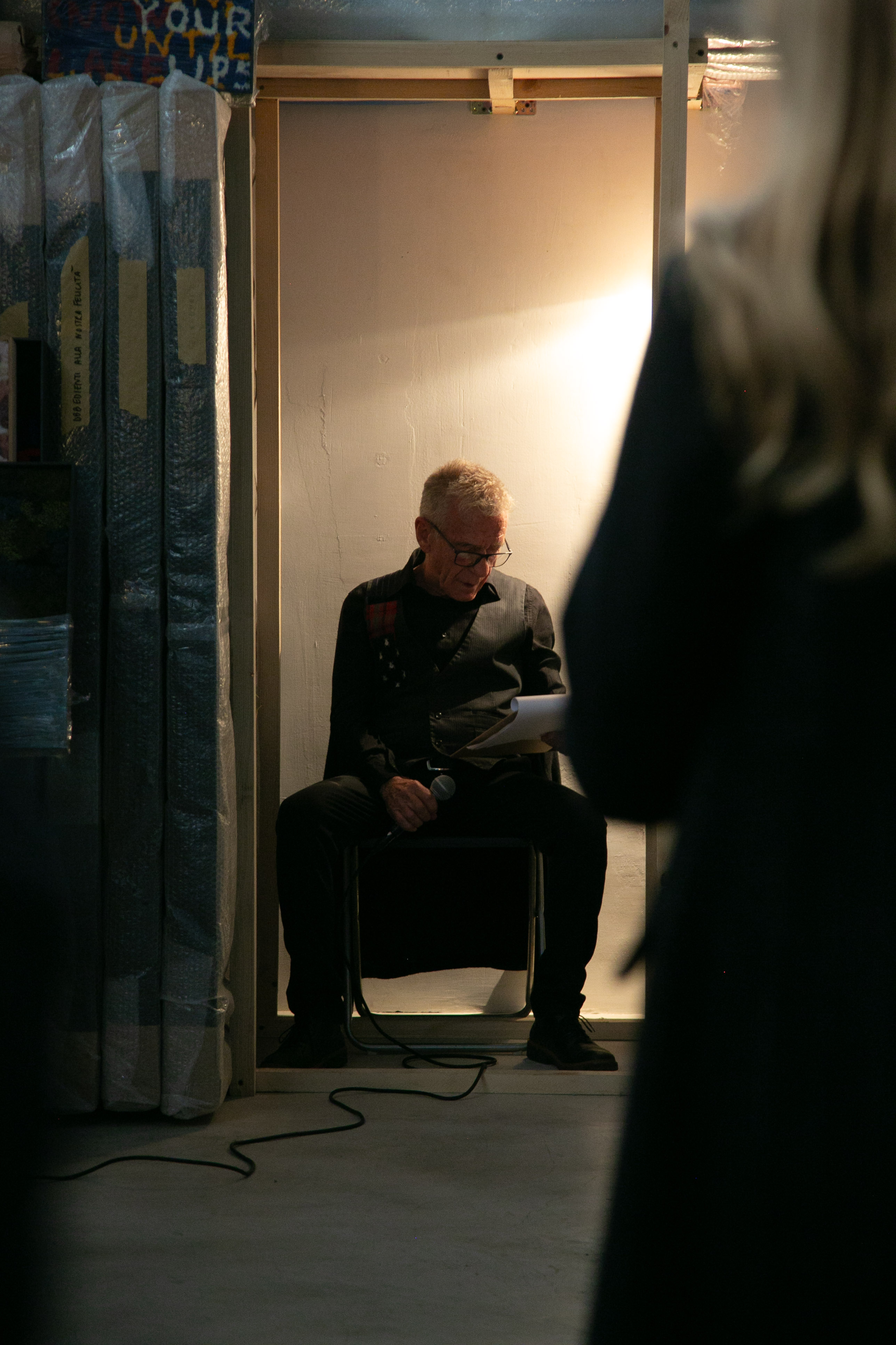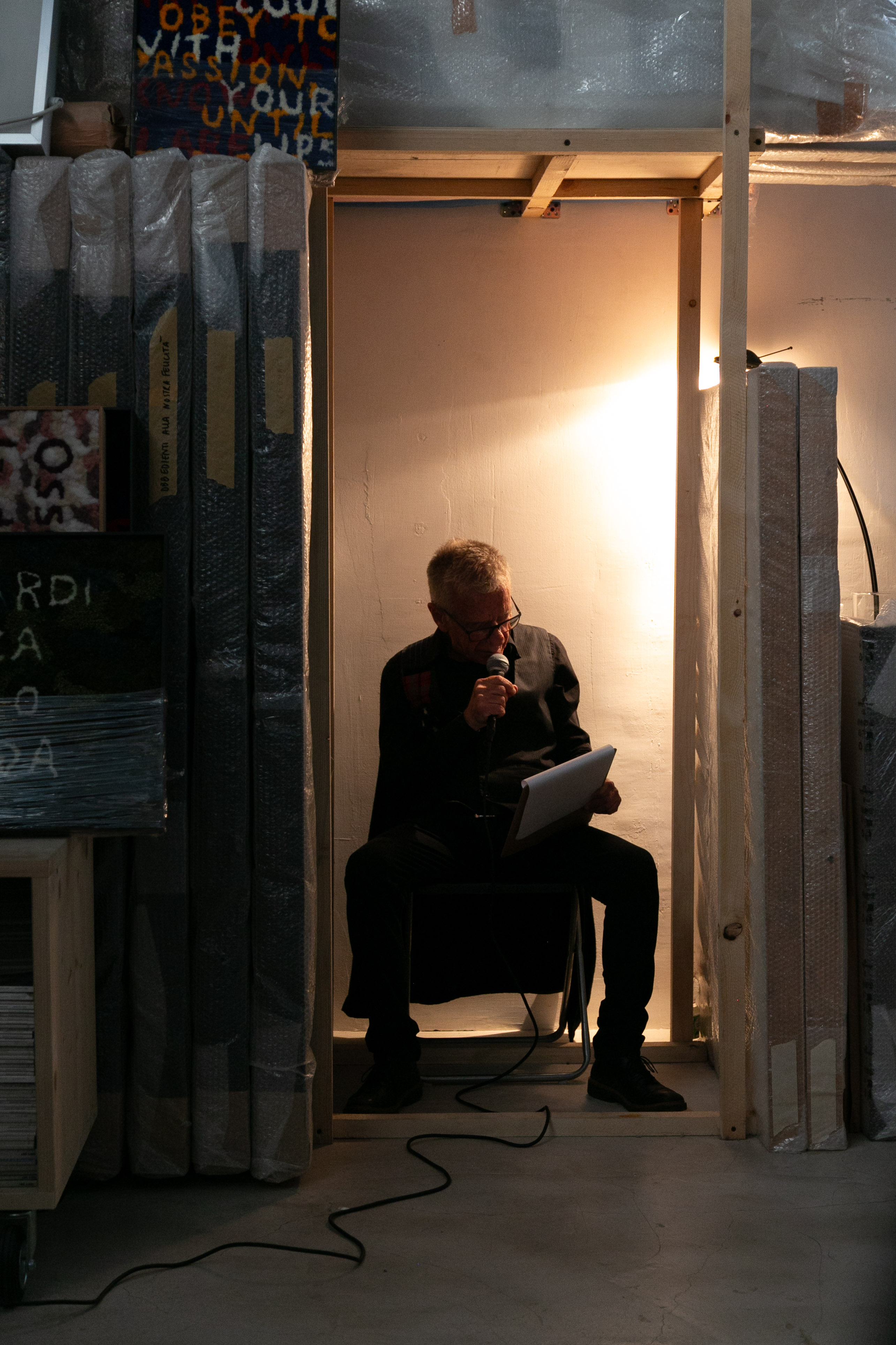Il secondo momento si svolge nel secondo studio di Numero Cromatico, situato nell’area dei marmisti, e vede la partecipazione di Gerolamo Alchieri – attore, doppiatore e direttore del doppiaggio italiano – impegnato in una lecture performance basata su una selezione di testi poetici tratti dalla raccolta Poesie sulla fine.